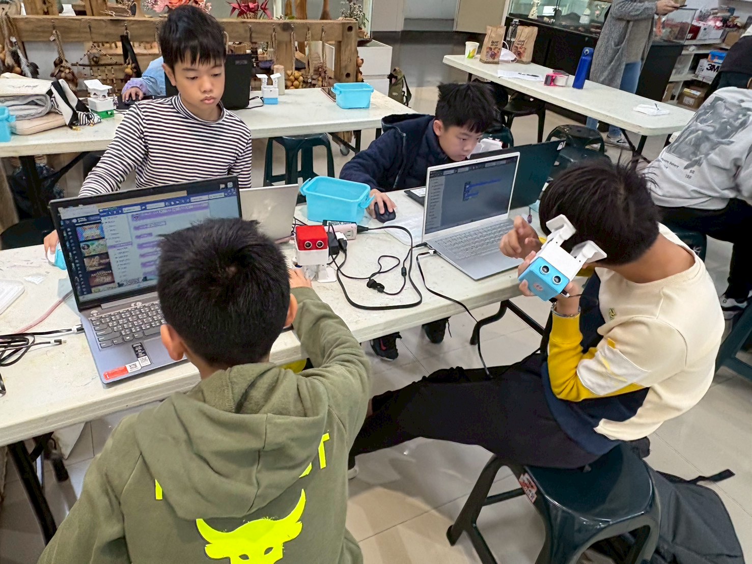 本次課程由樹藝工坊工藝師李永謨老師與國立虎尾科技大學永續發展暨社會責任處執行長、雲林官邸兒童館館長林正敏老師共同指導,採「組裝機器人—編寫軟體—工藝裝飾—成果展示」的教學流程,循序引導學員從入門操作進階至走路、跳舞等動作表現,並透過任務挑戰與反覆調整,培養運算思維、問題解決與團隊合作能力,確保每位學員皆有明確作品產出與舞台展示。