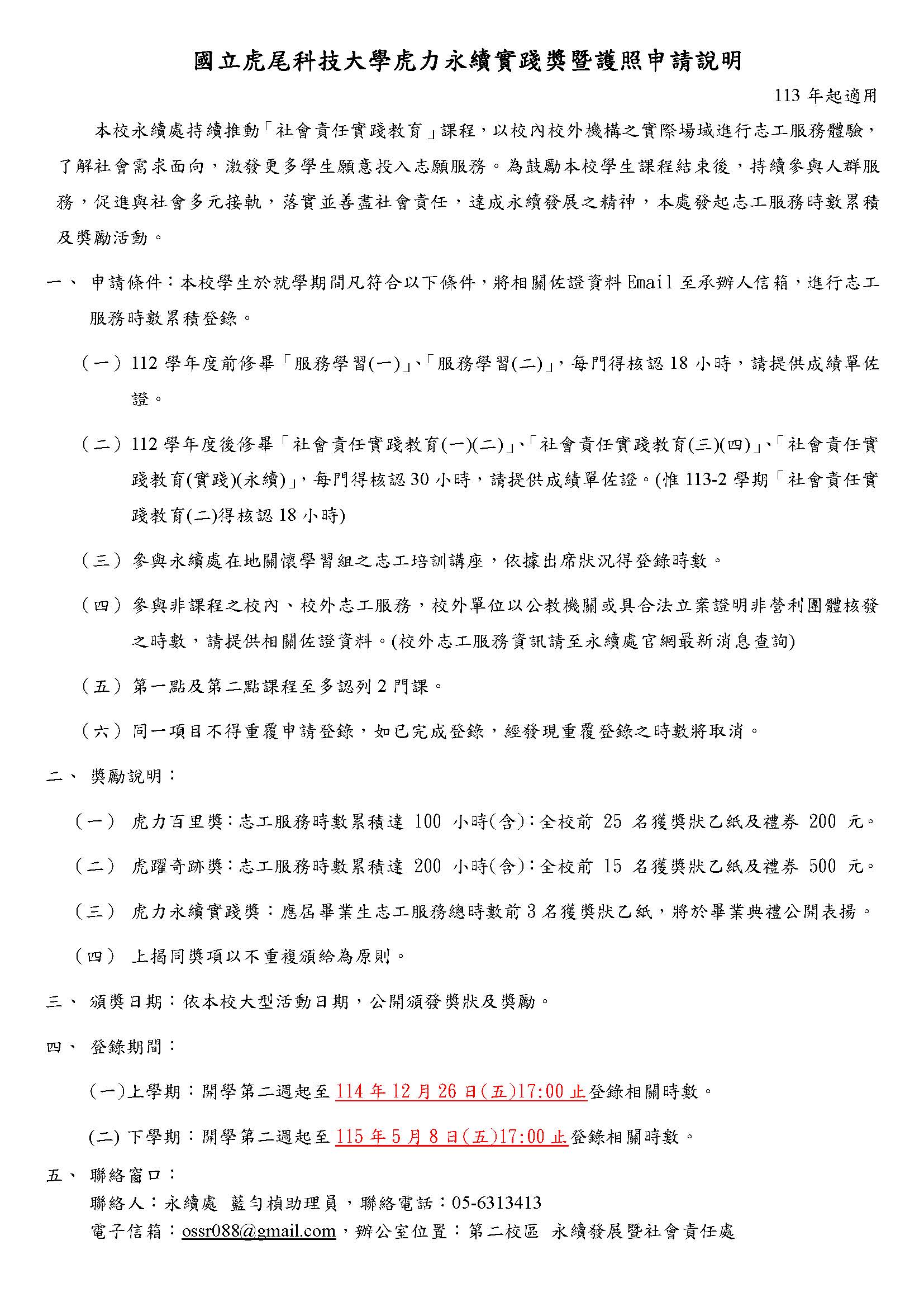 【志工獎勵】國立虎尾科技大學虎力永續實踐獎暨護照申請說明 2025-10-02 AdminAdmin 申請說明,詳如附件所示: 歡迎加入志工服務交流群:https://line.me/ti/g/VOU4ZcxlXe 志工服務時數累積及獎勵申請說明114-1學期公告版本.pdf
